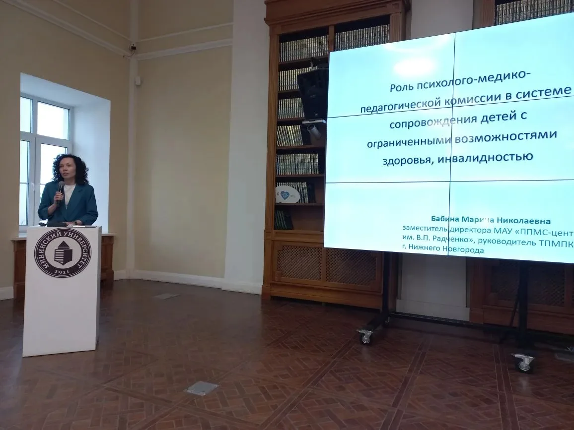 Заместитель руководителя МАУ «ППМС-центр имени В. П. Радченко», руководитель ТПМПК города Нижнего Новгорода Бабина Марина Николаевна выступала на пленарном заседании с докладом « Роль психолого-медико-педагогической комиссии в системе сопровождения детей с ОВЗ, инвалидностью».